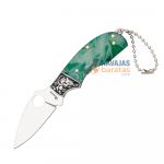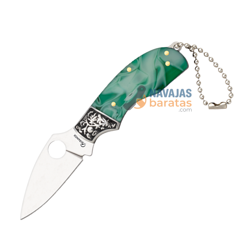 El elemento más llamativo es su mango de acrílico verde con efecto veteado, que crea un juego visual dinámico y atractivo. Este material no solo ofrece una apariencia única, sino también ligereza y resistencia, garantizando un uso cómodo en cualquier situación. Su diseño ergonómico facilita el agarre, aportando una sensación agradable en mano.