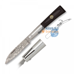 La Navaja Damasco ALBAINOX Estilo Taramundi Negra es una navaja ligera de fabricación china, con hoja de acero damasco de 60 capas y diseño tradicional. Su mango en estamina negra con detalle mosaico aporta elegancia, mientras que el cierre de pistón garantiza seguridad.